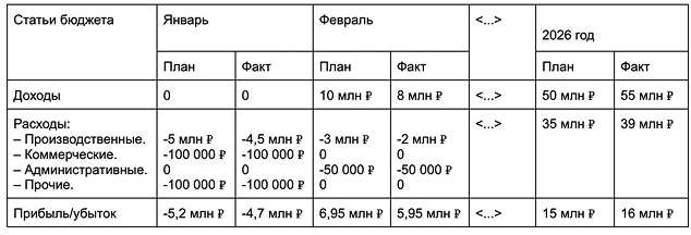 По этому плану компания распределяет расходы на подразделения и конкретные статьи учета, с ним же и сверяется. По БДР видно, что в январе доходов нет — компания будет строить коттеджи, а на продажу пока ничего нет. В феврале ситуация изменится.